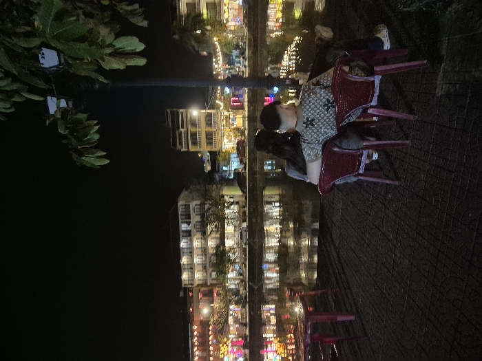 The image displays a nighttime scene in Hội An Ward, Vietnam. In the foreground, two individuals are seated in red plastic chairs on a dark tiled pavement. The male, positioned on the right, wears a light-colored patterned short-sleeved shirt and dark trousers. The female, seated to his left, wears a dark top and has long dark hair, with her left arm resting on the male's right shoulder. Both individuals are oriented away from the camera, facing a body of water. To the far left, a red plastic table and a partial red chair are visible. A dark lamppost with a light fixture and green foliage extends from the right foreground. A dark body of water, likely a canal or river, occupies the midground, prominently reflecting numerous artificial lights from the opposite bank. Across the water, multiple multi-story buildings are brightly illuminated with internal and external lighting, including string lights visible on structures to the left. The sky above the buildings is uniformly dark.
