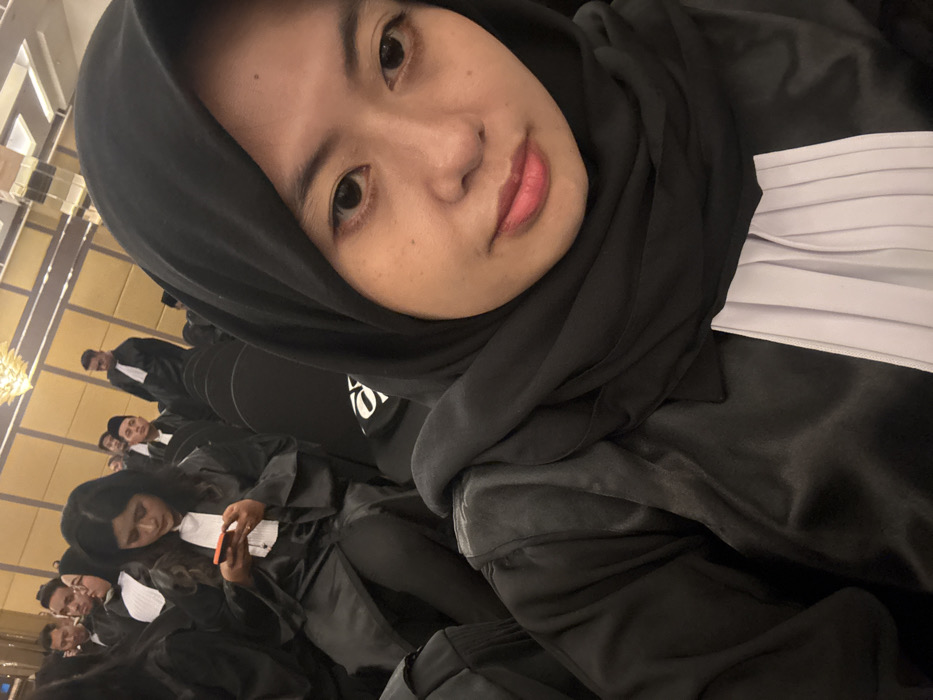The image depicts an indoor event within a large hall in Surabaya, Indonesia. In the immediate foreground, a young adult female with light skin, dark eyes, and red lipstick is captured in a selfie, looking directly at the camera. She wears a black hijab, a black academic or judicial robe, and a white pleated bib. Behind her, multiple individuals, predominantly young adults, are seated in rows of black chairs. These individuals are uniformly dressed in black robes with white pleated bibs. One female in the mid-ground is observed looking down at and operating a smartphone encased in orange. The background features light-colored walls and overhead decorative lighting fixtures. A white logo resembling "OA" is visible on the backrest of a black chair in the mid-ground.