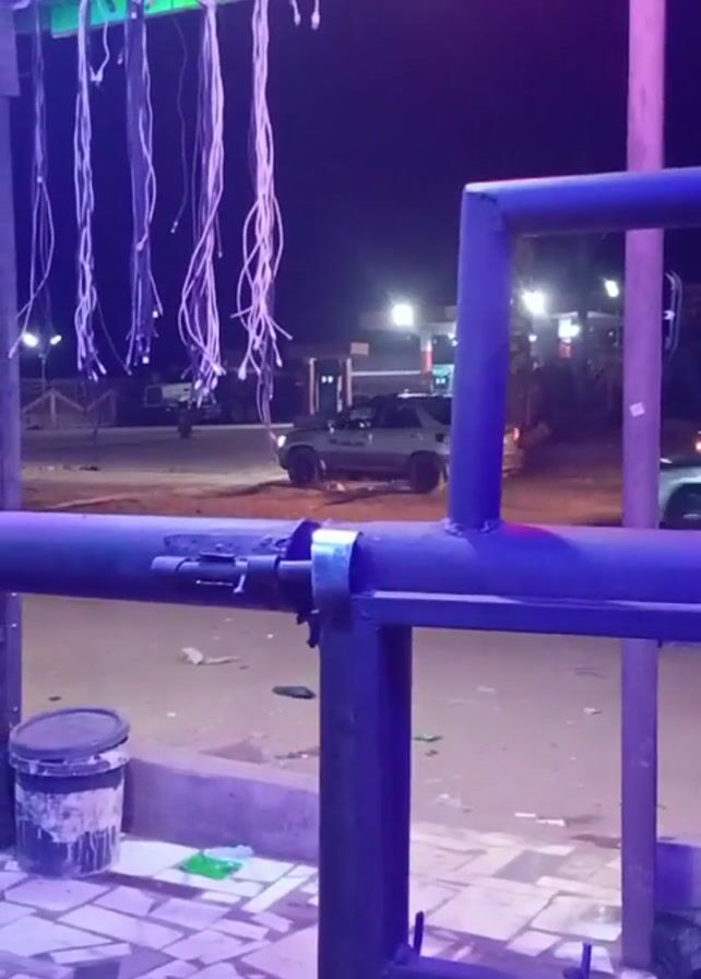 night scene with a view through a blue metal structure, possibly a fence or part of a building frame. In the background, there is a street with cars passing by. The street is lit by streetlights. Above the structure, there are several white cords hanging down, likely for decoration or lighting. The lighting in the scene appears to be a mix of white and purple hues. On the left side of the frame, there is a bucket on the tiled ground. The overall atmosphere is quiet and urban, captured at night.