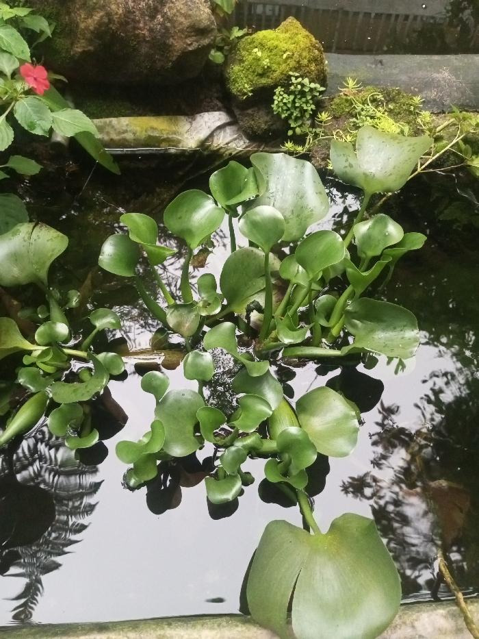 The scene depicts a close-up, overhead view of a body of water, likely a pond or constructed water feature, located in Ciherang, Indonesia. The primary subject is a dense cluster of floating water hyacinth plants (Eichhornia crassipes) dominating the central and lower portions of the frame. These plants feature numerous glossy green leaves, mostly round to ovate, supported by visibly swollen petioles. Leaf sizes vary, with smaller, newer leaves emerging amidst larger, mature ones. The water surface is dark and reflective, showing abstract patterns and subdued reflections of overhead objects not fully within the frame, including some lighter, possibly sky or structure reflections, and darker, intricate reflections of foliage. Along the upper and left edges of the water, the bank or edge of the feature is visible. It consists of large, dark grey-brown rocks, some of which are partially covered with vibrant green moss and small, unidentified green foliage. On the far upper-left, larger green leaves are present, with a single bright red flower protruding. A concrete or stone edge is visible at the bottom of the frame and horizontally across the upper middle, partially obscured by rocks and plants. No people or animals are present.