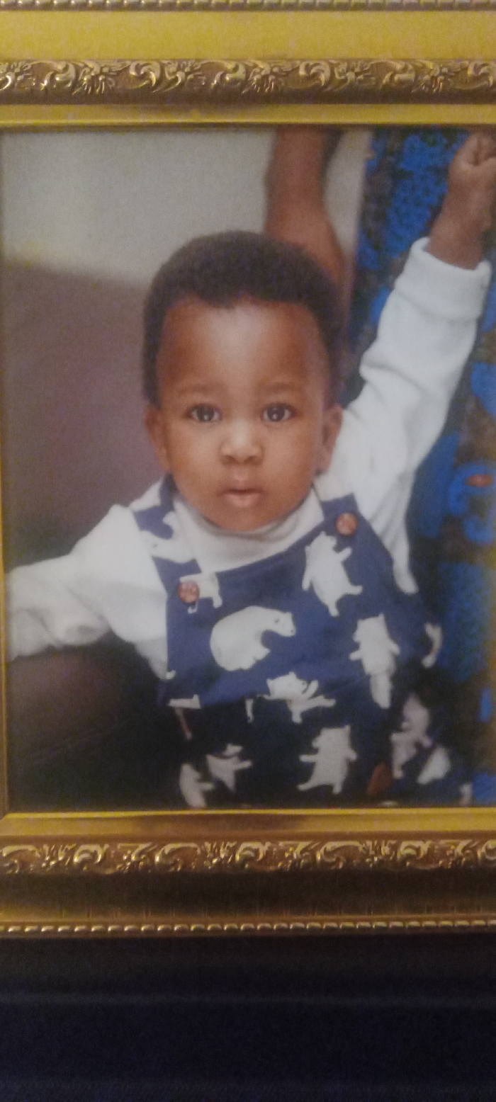 The image displays a framed photograph. The frame is ornate, gold-colored, featuring embossed floral or scrollwork designs along its inner border. Inside the frame, a young baby or toddler with dark skin, dark curly hair, and wide dark eyes stares directly at the viewer with a slightly open mouth. The baby is dressed in a white long-sleeved shirt beneath blue overalls patterned with white polar bear figures in various poses. Two brown buttons are visible on the right shoulder strap of the overalls. The baby's left arm is extended to the side, and the right arm is raised, with a hand forming a fist. The background within the framed photo consists of a light, indistinct surface on the left and a darker, blue patterned fabric, possibly part of an adult's clothing, on the right, with a partially visible dark-skinned arm supporting the child. The overall image captures this framed photograph resting on a dark, unidentifiable surface. A specific location within Abuja, Nigeria, is not visually discernible from the content of this image.