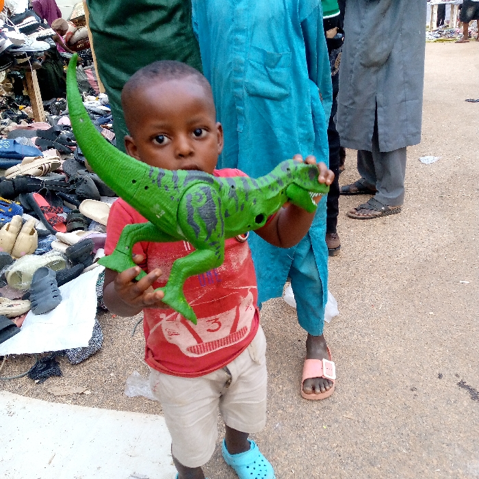 A young child holds a green toy dinosaur. The child wears a red shirt, beige shorts, and blue Crocs. The scene is a marketplace or shopping area, with piles of shoes and clothing in the background. Several adults stand nearby, partially visible. The ground appears to be paved or made of dirt.