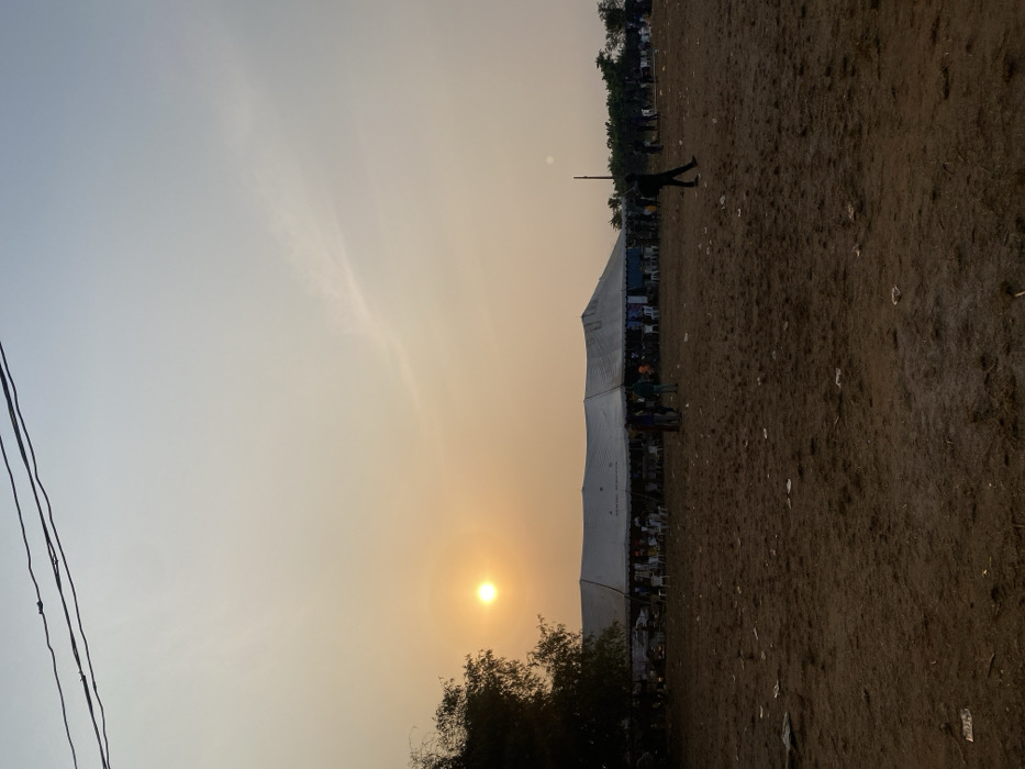 A tent structure hosts people seated inside, against a sky with the setting sun. A figure walks in the distance on a dirt ground scattered with litter. Power lines extend across the sky. The landscape is hazy, with trees visible near the tent.