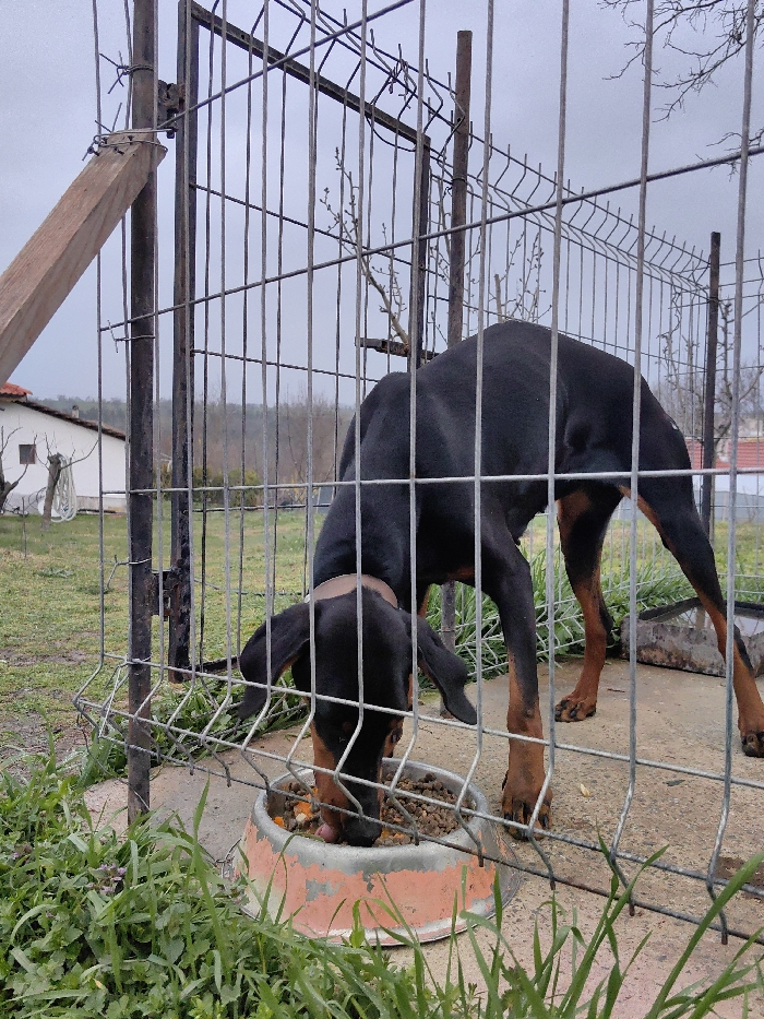 - "A Doberman Pinscher, primarily black with tan markings on its muzzle, chest, and legs, is depicted within a wire mesh enclosure in Saedinenie, Bulgaria, under an overcast sky" by FM-tqeth1, licensed under CC BY 4.0