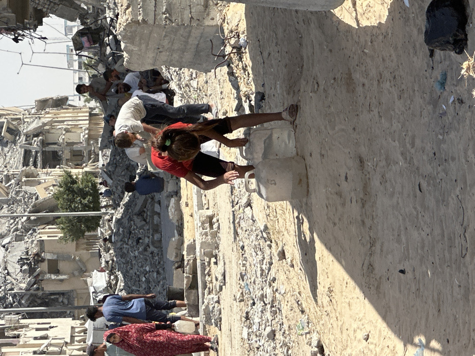 The image depicts an outdoor scene of extensive urban destruction in al-Qarara, Palestinian Territory. In the immediate foreground, a young person with long brown hair, wearing a red t-shirt, dark shorts, and light-colored sandals, is bent over, holding two clear plastic jerrycans, filled with water, one in each hand. The ground is sandy, scattered with small debris, and marked by pronounced shadows from the bright overhead sun. In the midground, several individuals are present amidst piles of concrete rubble and debris. To the left, a person in a red patterned garment walks alongside a young male in a blue t-shirt and dark pants. Further to the right, a group of men are congregated or sitting amongst the rubble, with one individual in a white t-shirt standing near the foreground subject. The background is dominated by the severely damaged and partially collapsed structures of multi-story buildings, reduced to skeletal remains and large mounds of concrete and rebar rubble. A small green tree stands amidst this devastation. The sky above is clear and light.