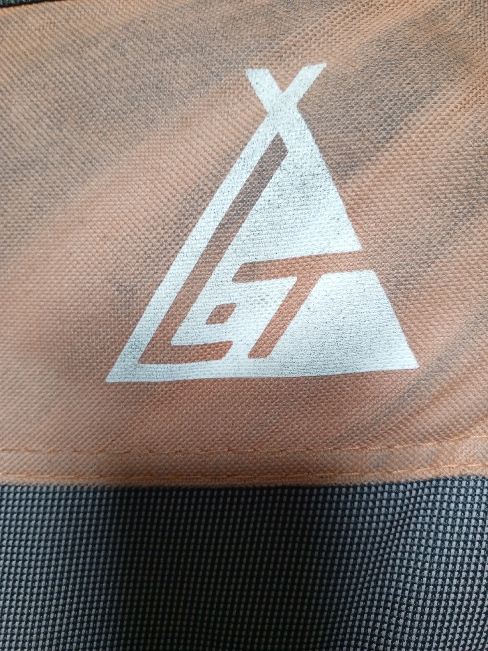 A close-up shot shows part of a bag or garment. The upper section is peach colored and has a white logo of a triangle with a slightly altered "X" at the top and the letters "ET" within. The fabric has a visible weave. The lower part is a dark, possibly gray or black, tightly woven material with a grid-like pattern. A visible seam separates the two sections.
