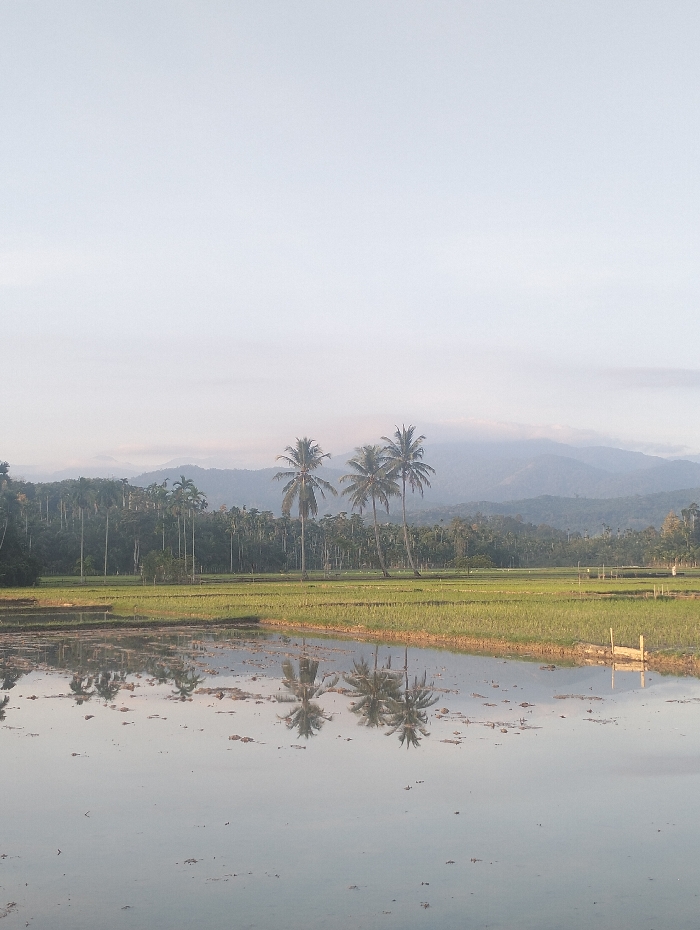 A serene landscape presents a reflective body of water mirroring palm trees under a pale sky. Rice paddies stretch into the distance, bordered by dense rows of trees. In the background, gentle mountains rise, partially obscured by a light haze or clouds. The tranquil scene evokes a sense of peace and natural beauty.