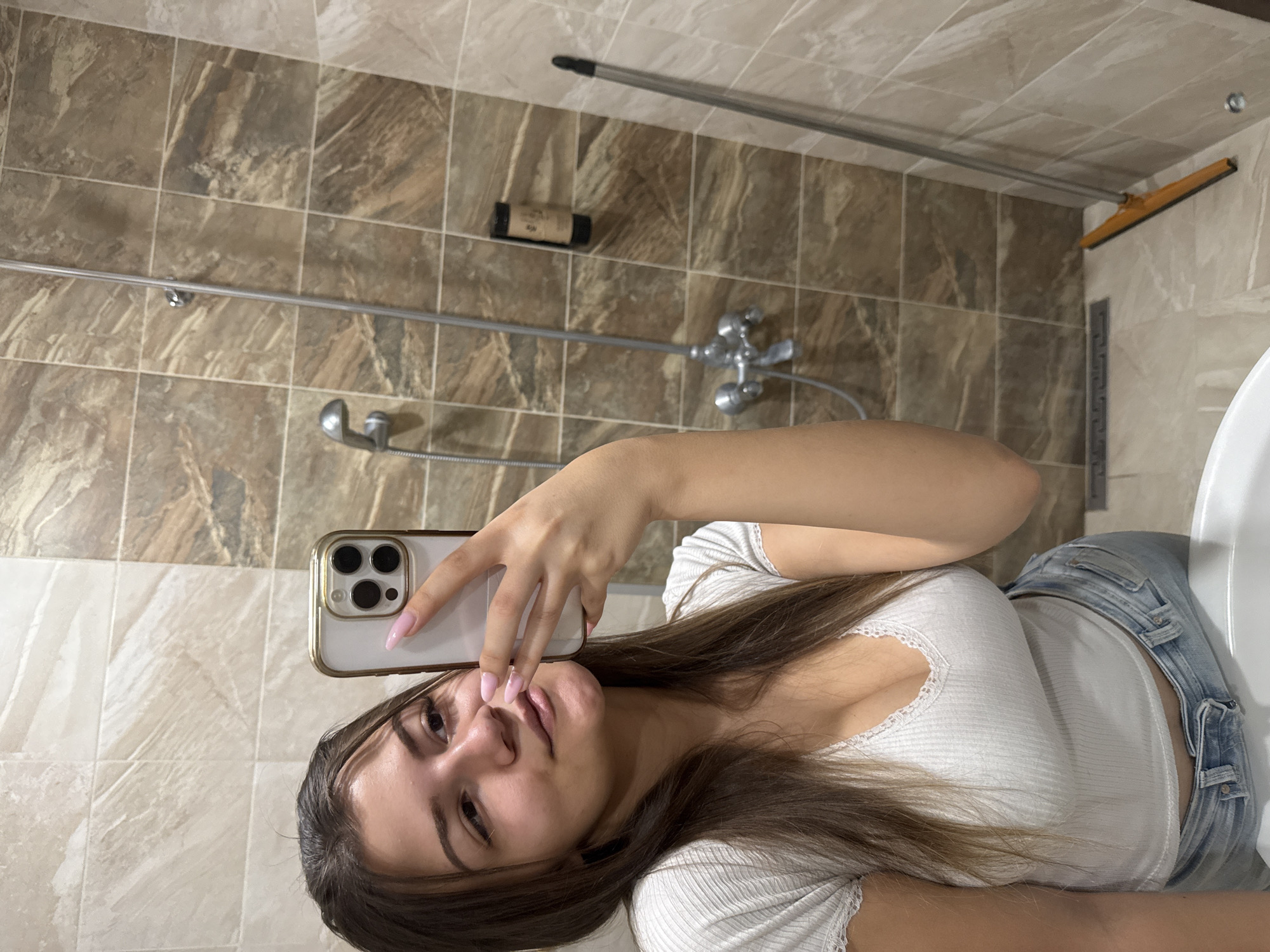A young woman is taking a selfie in a bathroom. She is holding a smartphone with a gold-colored case. She has long brown hair and is wearing a white ribbed shirt with lace trim. She is wearing blue jeans. The bathroom has brown tiled walls, a shower fixture, a shower rod, a squeegee, and a bar of soap mounted on the wall. A white toilet is also partially visible. The location is Marchevo, Bulgaria.
