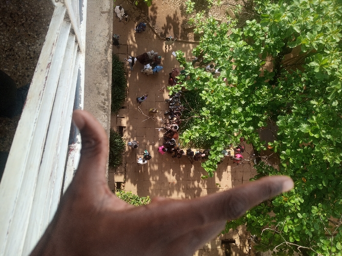 An overhead photograph captured from a balcony depicts a paved outdoor area or courtyard. In the lower foreground, a dark-skinned human hand with outstretched fingers partially obstructs the scene. White painted balcony railings are visible along the left edge of the frame. Below, approximately 20-30 individuals are present on the light brown paved ground, some dispersed and others gathered in a dense cluster or loose line near the center-right. They are dressed in various colored garments. The right side and portions of the left of the paved area are flanked by dense green foliage from trees and shrubs. Strong shadows cast by the vegetation and individuals indicate bright daylight. The scene is located in the city of Unknown, Unknown.