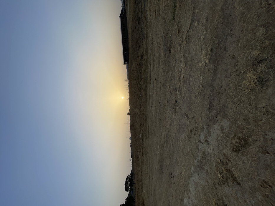 A landscape view features a dirt ground occupying the right side, gradually transitioning into a distant horizon. The sky, initially a light blue, shifts to a soft yellow near the horizon where the sun shines brightly. A dark building sits atop the horizon line. A small cluster of trees is situated in the lower center, providing a contrast to the open land.