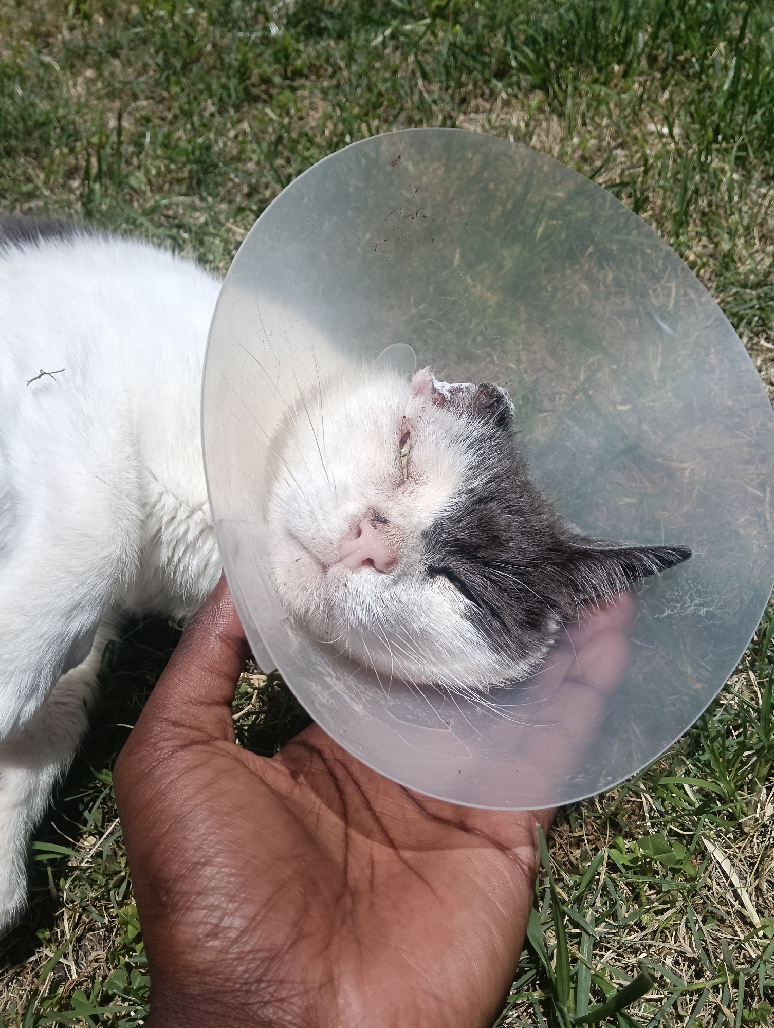 A person's hand is holding a cat wearing a transparent plastic cone. The cat is lying on a grassy surface, with patches of green grass visible around it. The cat is predominantly white with black markings on its head, particularly around the ears and one eye. The cat's eyes appear to be closed or partially closed, and it has a pink nose. The hand is brown in color. The location is not specified as Nairobi, Kenya, in the image.