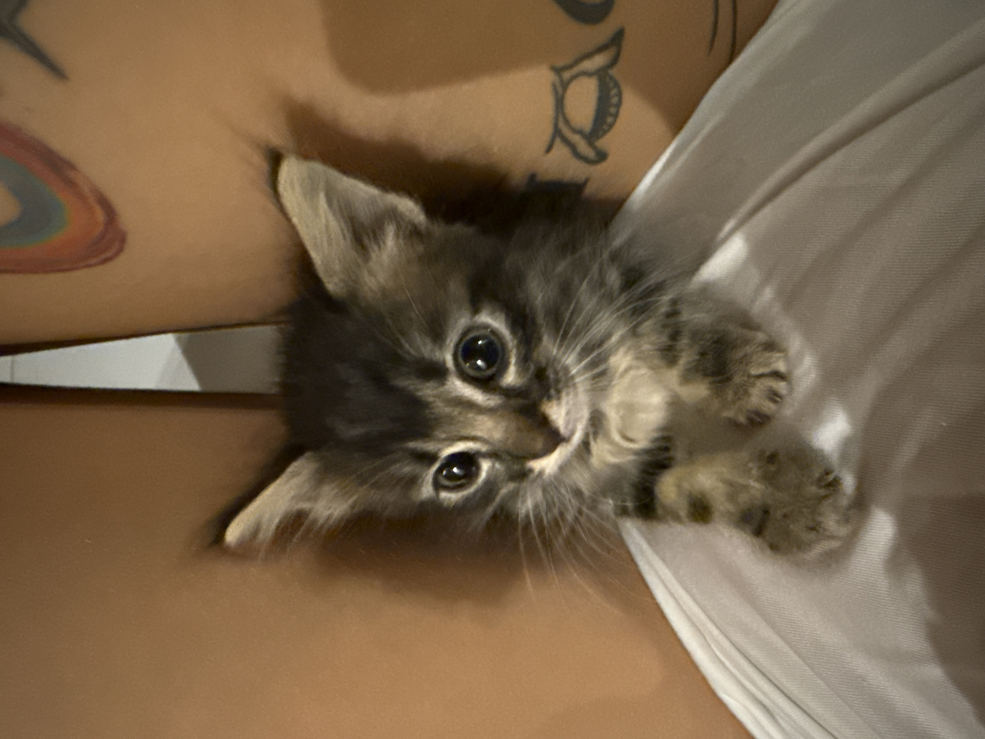 - "A close-up shot depicts a grey tabby kitten with large, expressive eyes nestled between a light-skinned person's arm, adorned with tattoos, and a white garment" by FM-hKpnb2, licensed under CC BY 4.0