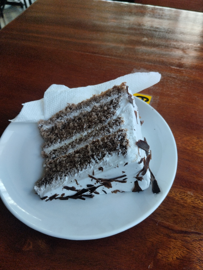 - "A high-angle photograph captures a single slice of layered cake on a white, circular ceramic plate, resting on a brown wooden table with a visible grain pattern" by FM-ceYJN2, licensed under CC BY 4.0