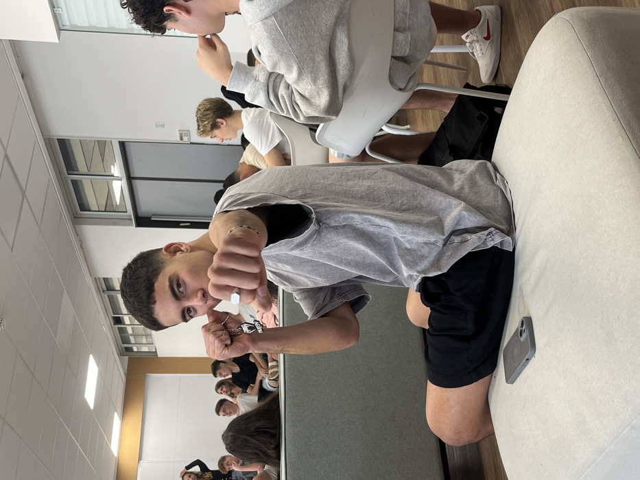 A young male with short, dark hair and light skin, wearing a grey short-sleeved t-shirt and black shorts, sits cross-legged on a light beige ottoman in an indoor setting. He faces the camera, extending his right arm forward with a clenched fist, displaying a silver signet ring on his right ring finger and a small keychain with a dark, possibly stylized animal head or logo, on his left thumb. A thin chain bracelet is visible on his left wrist. His expression is neutral, with direct eye contact. A grey mobile phone in a matching case lies on the ottoman to his left. In the background, a group of diverse young adults are seated. To the immediate right of the main subject, another young male, partially visible, wears a grey hooded sweatshirt and white sneakers, sitting on a white chair, looking to his right. Further back, several individuals are seated on grey cushioned benches or chairs, some facing forward, others in profile. A female with long dark hair is partially visible on the far left, standing slightly behind the seated group. The room features white walls, large rectangular windows with horizontal blinds on the right, and a light-colored wooden floor. Overhead, rectangular fluorescent lights are recessed into the white ceiling. The overall impression is that of a modern educational or communal space, such as a classroom, lecture hall, or study lounge, in Tel Aviv, Israel.