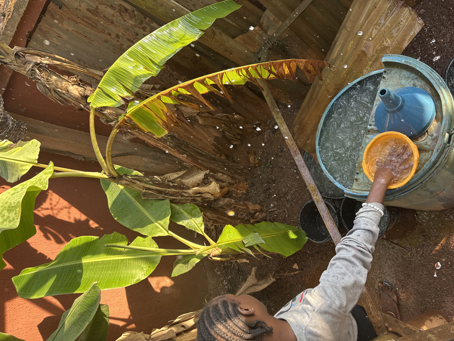 The image captures an outdoor scene in Agbogugu, Nigeria. A person, viewed from behind, is positioned towards the center-left. This individual has braided hair, wears a grey long-sleeved top and dark flip-flops, and has their right hand immersed in a yellow plastic bowl. The yellow bowl is situated inside a larger, light-blue cylindrical barrel that is partially filled with water. A blue funnel-like object rests next to the yellow bowl within the barrel. To the left and foreground of the barrel, several dark-colored buckets are visible on the reddish-brown soil ground, some appearing to contain water. A long, dark metal bar or pipe extends diagonally across the mid-ground. Numerous small water droplets are suspended in the air, particularly prominent in the upper and right portions of the frame, indicating active water movement or splashing. In the background, multiple banana plants with large, green leaves, some exhibiting brown, dried sections, are visible. These plants stand against a reddish-orange wall. Sunlight illuminates the scene, creating distinct shadows and highlights on the foliage and ground.