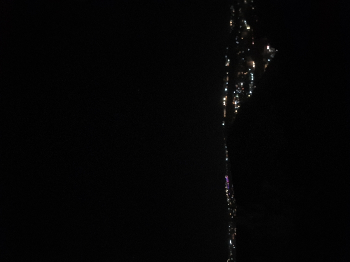 This image presents a nighttime panoramic view of the city of Ma'raba, Syria, observed from an elevated perspective. The upper two-thirds of the frame are entirely black, indicating the night sky. The lower third displays a horizontal band of numerous scattered artificial lights, primarily white and yellow, which delineate the urban area. Some faint colored lights, including magenta and blue, are visible within the light clusters on the left side. The terrain directly beneath the lights is dark and indistinct, suggesting an unlit landscape or ground contour. No individuals, specific objects beyond the lights, actions, or interactions are discernible in the scene. The lights appear somewhat diffused or out of focus.