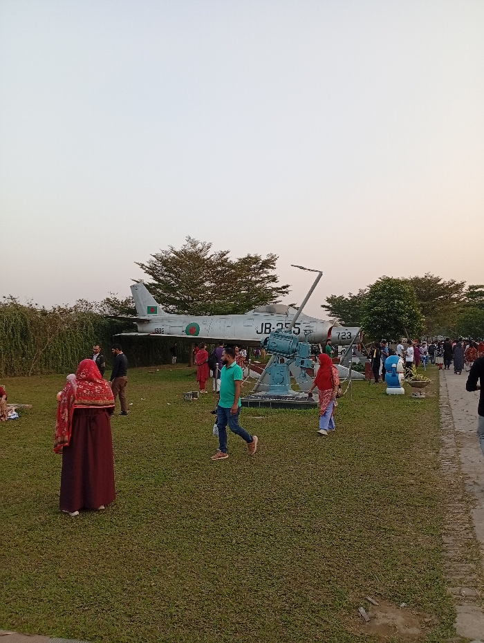 The image captures an outdoor public display area within the Fantasy Kingdom Amusement Park in Ashulia, Dhaka, Bangladesh, specifically the Heritage Park section. A light gray MiG-21 fighter jet, marked with "JB-255" and "723," and bearing the Bangladesh flag on its tail, is centrally displayed on a raised platform over green grass. To the right of the aircraft, a light blue anti-aircraft gun is mounted on a stand. Numerous individuals are present throughout the scene. In the immediate foreground, a woman in a long, dark red dress with a matching head covering stands facing away from the viewer. To her right, a man in a bright green t-shirt and blue jeans walks across the grass, carrying a small white object in his left hand. Further right, a woman in a red tunic and light blue pants, with a red headscarf, walks towards the anti-aircraft gun. Multiple other people are visible in the mid-ground and background, walking on the grass and a paved pathway, or standing near the displayed equipment. The sky is clear and light-colored, suggesting late afternoon conditions. The ground is predominantly green grass, bordered by trees and hedges in the background and along the left. A modern streetlamp is visible above the tree line on the right.
