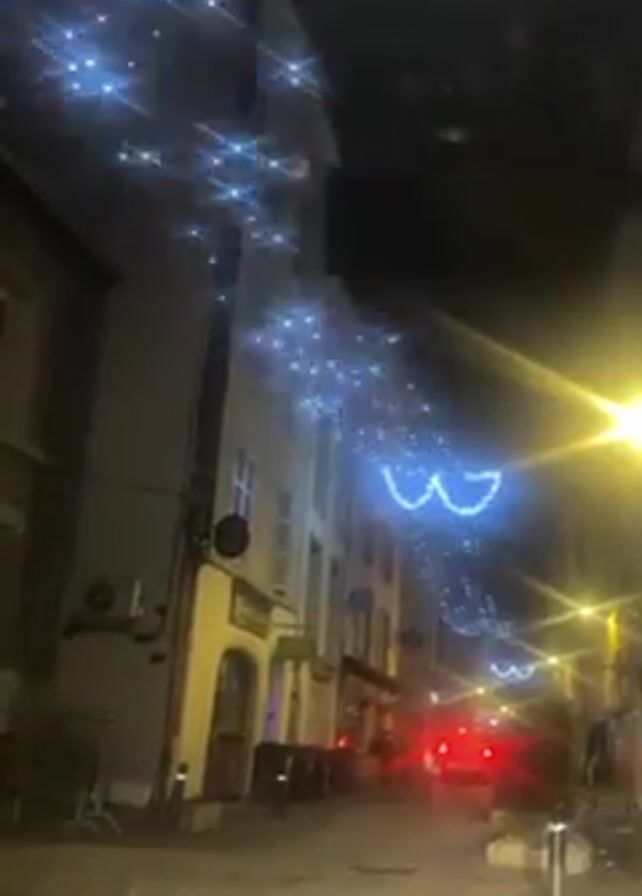 A nighttime view from inside a vehicle looking down a narrow European street decorated with holiday lights. The street is lined with buildings, some painted beige, and the lights include strings of white stars and blue garlands. A vehicle with red tail lights is visible further down the street. There are black trash receptacles near the buildings. The lighting is dim with bright spots from the street lights.