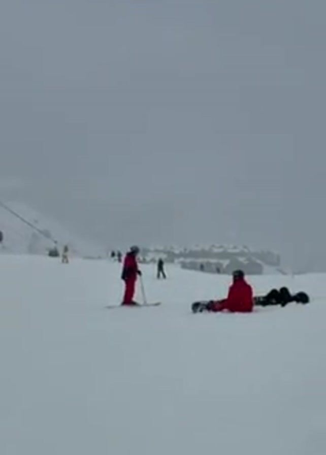 snow-covered slope on a cloudy day with light snowfall. In the foreground, there's a person standing with skis and poles, wearing a red ski suit and helmet, facing toward the center of the frame. To the right, another person is sitting in the snow with a snowboard, also wearing a red ski suit and helmet. In the background, there are several other people skiing and snowboarding, and there's a building with a unique, multi-peaked roofline visible on the slope further up. A ski lift cable is also partially visible in the distance on the left.