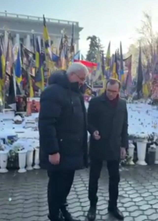Two men stand on a brick-patterned plaza, in front of a memorial site adorned with numerous Ukrainian flags. The man on the left wears a dark, puffy jacket and black pants. He has short white hair and wears glasses. The man on the right is dressed in a dark coat, dark pants and glasses with a red scarf. They shake hands briefly then stand side-by-side. A building with columns is visible in the background. The day appears bright with little cloud cover. Some snow is scattered around the memorial.