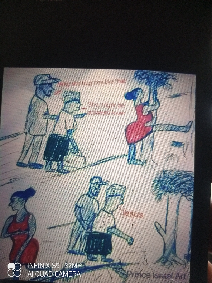 This image is a photograph of a hand-drawn sketch, likely a comic strip or narrative illustration, displayed on a digital screen, located in Awjaw, Nigeria. The drawing style is simple and cartoonish, utilizing blue ink for outlines, shading, and tree foliage, and red ink for female attire and specific text. Diagonal line patterns, consistent with a screen artifact or paper texture, are visible across the image. The drawing is segmented into distinct scenes. The top section depicts three figures and a tree. On the left, a male figure wearing a cap and long-sleeved garment stands behind a second male figure, who appears blindfolded or has his eyes covered, wears a head covering, a light-colored shirt, and dark shorts, with both arms extended forward. A red speech bubble originating from the first male contains the text: "Why she hug mee like that." A second speech bubble, pointing to the blindfolded figure, states: "She might be a b'alat she love." To the right, a female figure in a red dress is shown in an exaggerated pose near a tree with blue foliage, with her arms raised as if holding a branch and one leg lifted high and extended horizontally. The bottom section features three additional figures and a smaller tree. On the bottom left, a female figure, dressed in a red outfit similar to the one in the top section and with her hair tied up, stands facing left with her arms crossed or hands on her hips. In the bottom middle, two male figures are depicted in a stance similar to those in the top left. One male, wearing a cap, stands behind another male who also wears a cap or head covering, a light-colored shirt, and dark shorts, with his right arm outstretched forward. The word "Jesus" is written in red next to the head of the forward-reaching male. A small tree with blue foliage is visible on the bottom right. A digital watermark "INFINIX S5 | 32MP AI QUAD CAMERA" is present in the lower left corner, indicating the device used to capture the photograph. The signature "Prince Israel Art" is visible in blue ink at the bottom right of the drawing.