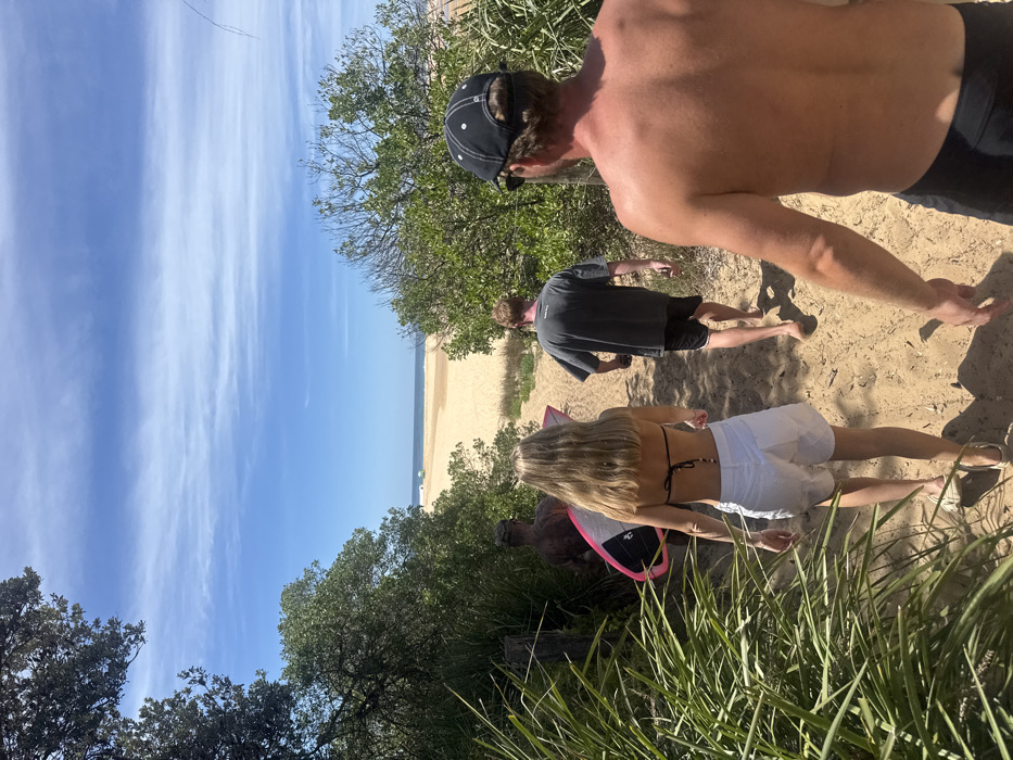 Four people walk towards a sandy beach under a clear blue sky. The foreground is filled with green foliage. A bare-chested man with a baseball cap leads, followed by a person in a gray shirt. A woman in white shorts carries a pink and black skimboard. The beach is visible in the distance with a few people enjoying the sunshine. The camera angle looks down towards the scene.