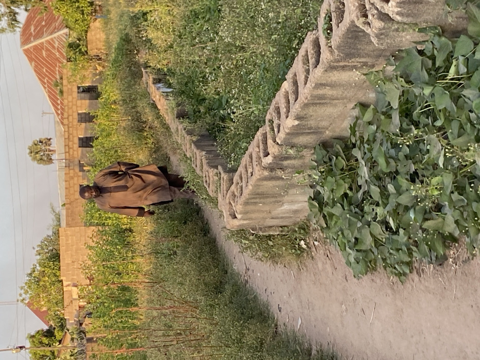 The image depicts an outdoor scene in Udu, Nigeria, during what appears to be late afternoon or early evening. A sole adult male subject, of dark complexion and stocky build, walks on a narrow, unpaved dirt path that curves slightly from the foreground towards the background. He is dressed in a dark brown traditional tunic and trousers, with his right hand placed into a pocket. His gaze is directed downwards and slightly to his left. To the immediate right of the path, a low retaining wall constructed from concrete blocks runs parallel to the path. This wall is approximately three to four blocks high and shows signs of weathering. Beyond the wall and on the left side of the path, the ground is overgrown with dense green vegetation, including various weeds and taller plants, some of which appear cultivated. In the background, several structures are visible under a pale, clear sky. These include unfinished concrete block buildings with open window frames, and one building featuring a reddish-brown corrugated metal roof. Sparse trees and bushes are interspersed throughout the background, including a distinct tall palm-like tree. The overall environment suggests a semi-developed or rural-urban transitional area.