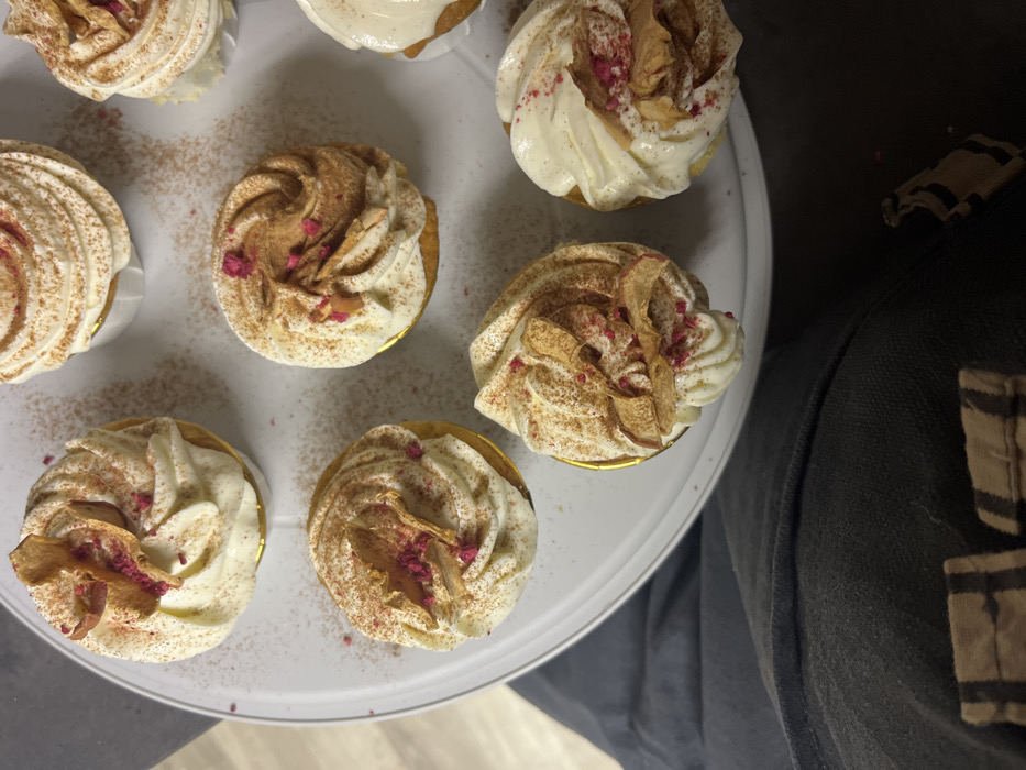 The image presents an overhead, close-up view of eight cupcakes displayed on a white circular tray. Each cupcake features a light-colored, swirled frosting generously dusted with a reddish-brown powder, likely cinnamon, and adorned with multiple pieces of light brown, dried, thinly sliced fruit, possibly apple or pear. Scattered amongst these are small, bright pink, granular particles consistent with freeze-dried raspberries. The cupcakes are housed in white fluted paper liners, some of which exhibit a golden rim. Traces of the reddish-brown powder are also scattered across the white tray surface. The tray rests on a person's lap, indicated by the dark gray fabric of pants visible in the lower section of the frame, with a small portion of a striped textile element also discernible. This scene is located in Meisenheim, Germany.