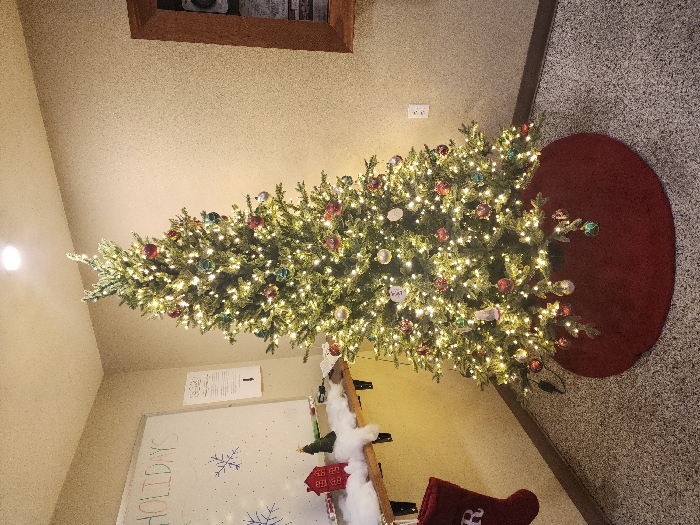 A well-lit Christmas tree adorned with colorful ornaments and white lights sits in a room with a red tree skirt. A whiteboard with holiday-themed drawings and the word "HOLIDAYS" is nearby, along with Christmas decorations on a wooden shelf. The room features a patterned carpet and beige walls. A framed object is mounted high on the wall near the ceiling.