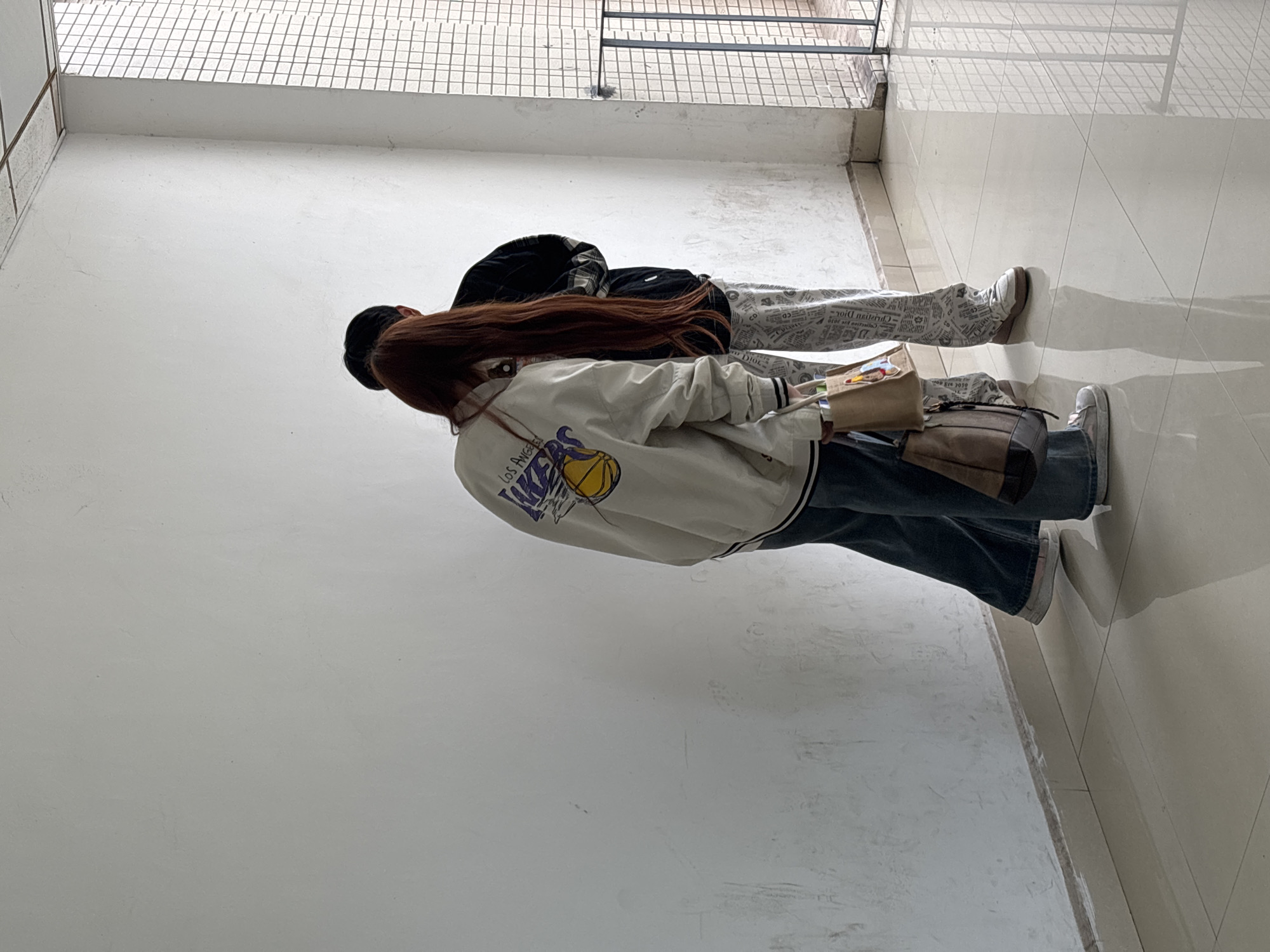 Two people stand in a brightly lit indoor area, likely a hallway or corridor, with white walls and light-colored tile flooring. The first person is wearing a light-colored Los Angeles Lakers jacket and dark-colored jeans, carrying a brown bag, and has long brown hair. The second person, slightly behind, is wearing a black jacket and patterned pants. The location is plausibly Jiangjin, China, based on potential architectural styles.