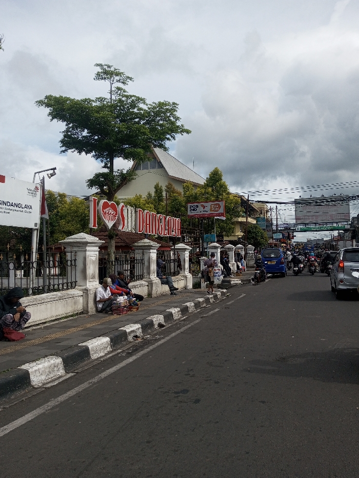 This image depicts a street scene in the city of Saing Ta Mawt Lay, Myanmar, under an overcast sky. A paved asphalt road occupies the right side of the frame, bordered on the left by a concrete sidewalk featuring a decorative white barrier with ornate pillars and black metal railings. On the sidewalk, several individuals are present; one person wearing a dark hoodie squats on the far left, while three other individuals sit together near the barrier, appearing to be street vendors with various small items displayed before them. Prominently featured behind the barrier is a large "I ❤️ DANGALAYA" sign with a red heart icon, positioned amidst lush green foliage from a tall tree. To the left of this, a white sign reads "SINDANGLAYA" with smaller text below it specifying "Kec. Sindang Jaya Kab. Cianjur Jawa Barat." Another smaller sign for "POS IND" is visible further right. In the background, buildings with light-colored roofs and more trees are visible, along with a dense network of overhead utility lines. The road shows active traffic, including a partial view of a silver SUV on the far right, a blue minivan, and multiple motorcycles.