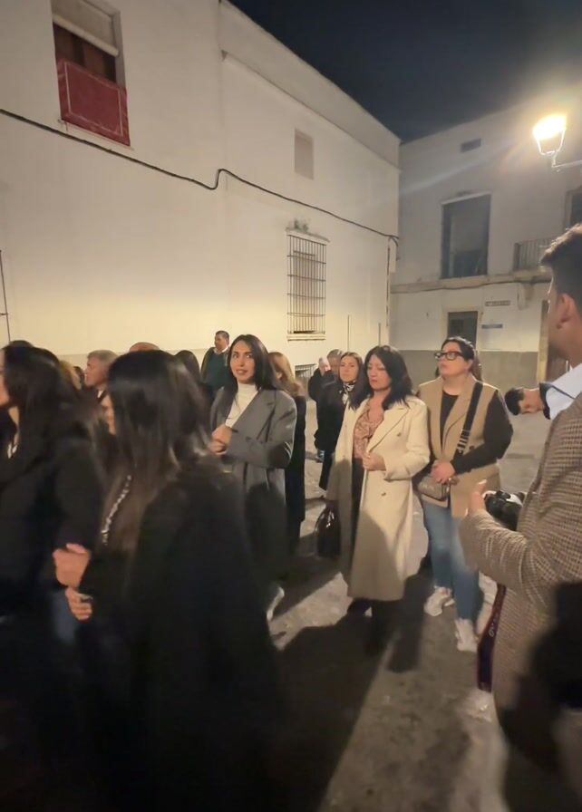 A crowd of people gathers on a narrow street, illuminated by overhead lights at night. The group is a mix of men and women dressed in various outfits, including coats and dresses, suggesting a formal occasion. The backdrop is a long, white building with several windows. Some of the windows on the upper level have red frames. The atmosphere appears festive, though the exact nature of the gathering is unclear from the visuals alone.