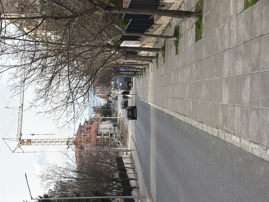The image depicts a street scene in Sveti Vlas, Bulgaria, looking eastward towards the sea under an overcast sky. The foreground features a light grey concrete slab sidewalk on the right, bordered by a curb separating it from a two-lane asphalt road. A line of approximately ten bare deciduous trees, with small patches of green grass at their bases, runs along the sidewalk. Parallel to the trees, a black metal fence with horizontal bars encloses a higher-ground area or property. On the asphalt road, a black Audi sedan with Bulgarian license plates is traveling away from the viewer in the right lane. Further down the street, near a dark blue van parked on the right shoulder, two individuals are walking away from the camera. Several other vehicles, including cars and the van, are visible parked or in motion further along the street. A yellow diamond-shaped warning sign with a black border and a central symbol (likely a black exclamation mark) is prominently visible on the right side of the road in the mid-ground. The left side of the road also features a narrower paved sidewalk, lined with bare trees and a fence. In the mid-ground and background, multiple multi-story residential or commercial buildings with red-tiled roofs are visible. Dominating the left mid-ground is a tall yellow lattice construction crane, indicating active development. The distant background reveals a glimpse of the sea under the horizon. Streetlights are present on both sides of the road.