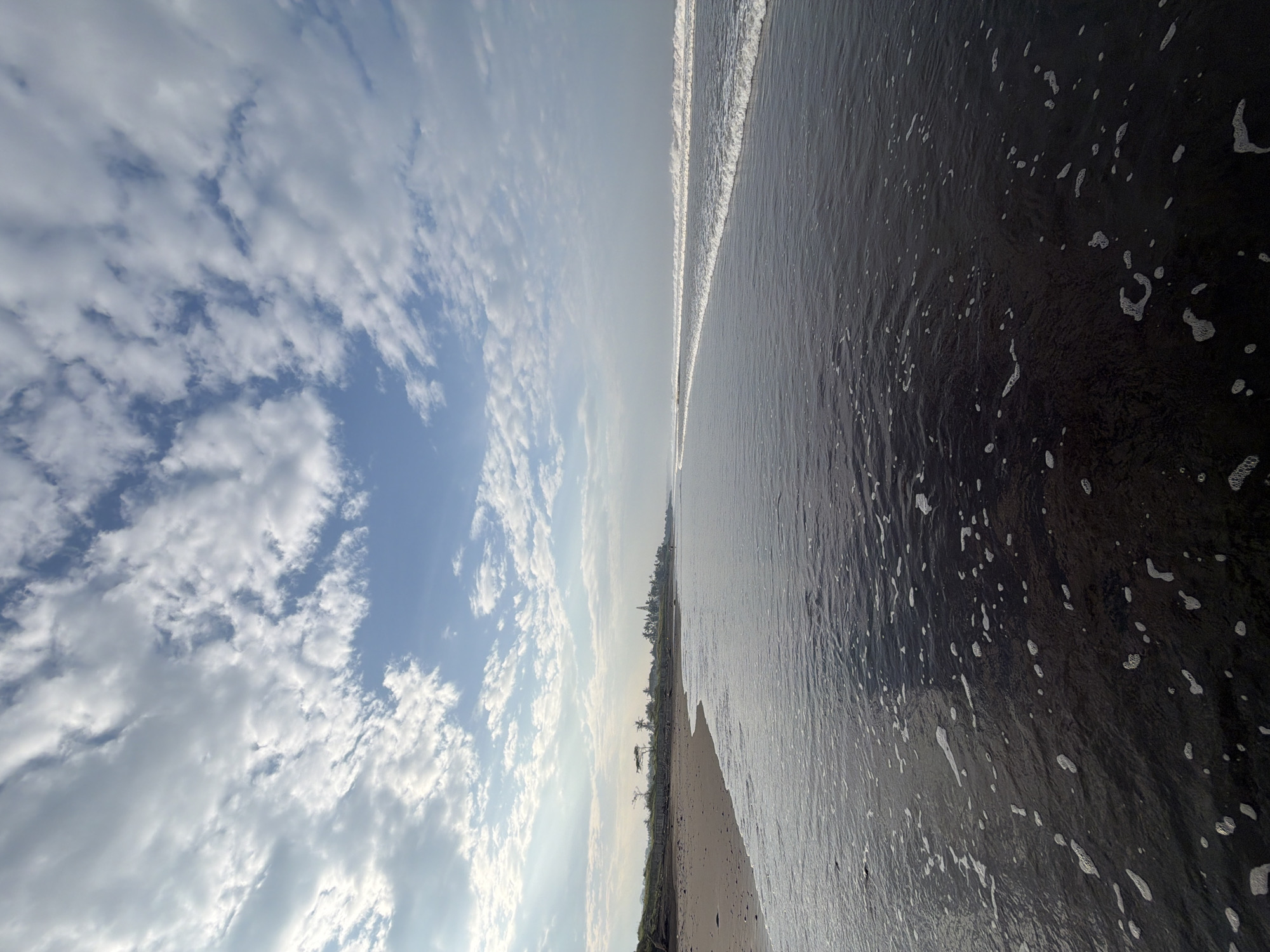 A wide-angle image captures a coastal scene in Sudimara, Indonesia. The upper third of the frame shows a blue sky with scattered white cumulus clouds, illuminated by diffuse bright light from the upper left. The horizon line bisects the image, separating the sky from the ocean and shoreline. The right portion of the image displays dark ocean water with multiple parallel lines of white-capped waves extending towards the distant horizon. The immediate foreground's water surface exhibits numerous patches of white seafoam. The left portion of the image features a dark, wet sandy beach curving inland from the water's edge. Along the distant left shoreline, a raised bank of earth with scattered vegetation and a line of palm trees is visible. No persons or distinct man-made objects are present.
