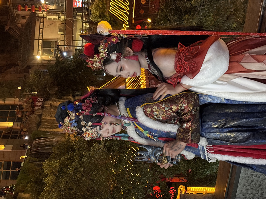 - "Two individuals in elaborate traditional Chinese-style costumes are captured at night in Yuzhong District, Chongqing, China, within what appears to be the Hongyadong complex" by FM-hd42B3, licensed under CC BY 4.0