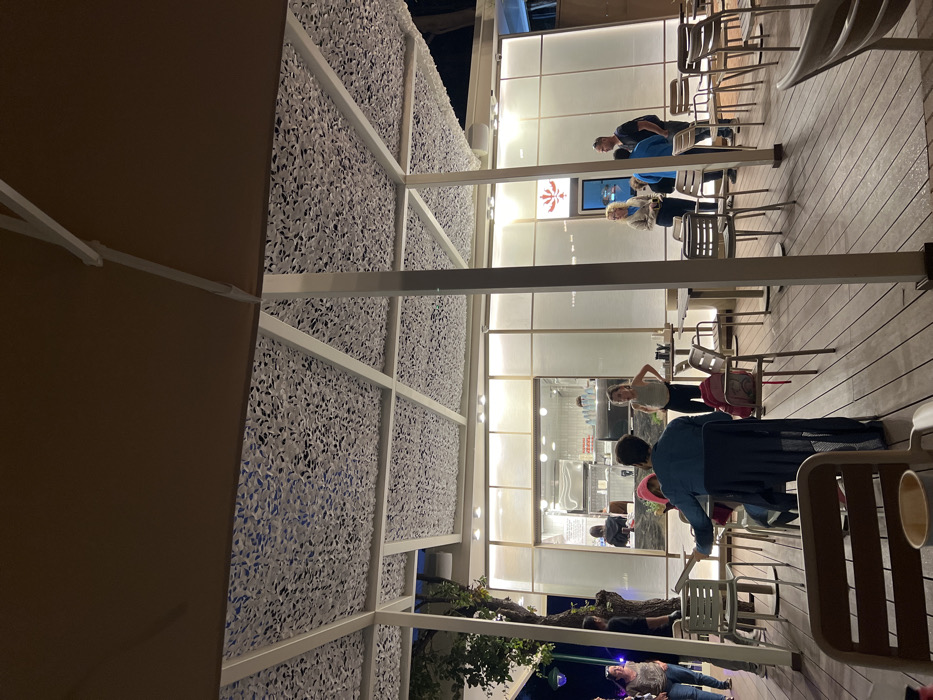 n outdoor patio with multiple people. Some are sitting at tables while others are standing and interacting. The patio is covered by a lattice-like structure providing shade. A building with large windows is visible in the background, and the lighting suggests it is evening or nighttime. Chairs and tables are scattered across the wooden deck surface of the patio.