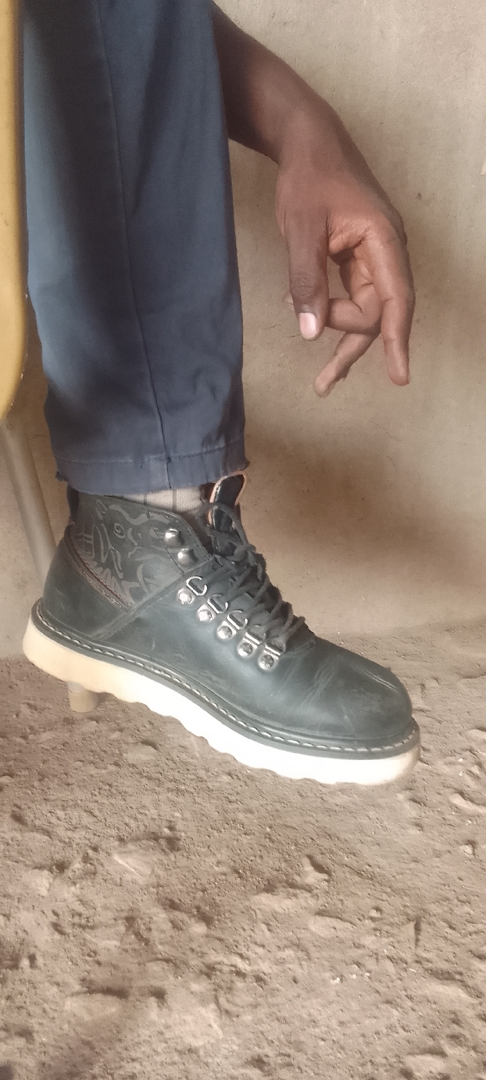 A person's leg and hand are visible. The leg wears dark blue pants and a black leather boot with a white sole. The boot has silver eyelets and decorative patterns on the side. The hand is dark-skinned and held in a relaxed pose near the boot. The background is a plain, light tan wall and a slightly textured ground. A portion of a yellow chair is also visible on the left.