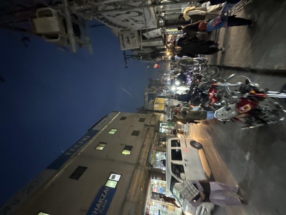 An urban street at dusk displays buildings with commercial signs. Parked motorcycles and a white van line the road. Pedestrians are walking along the street. Distant lights illuminate the background, and the sky is a darkening blue. A sign reads "CHAKZAI PLAZA."