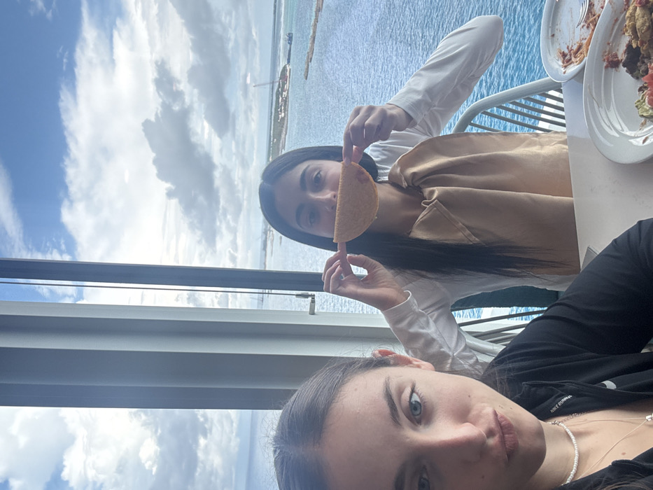 Two young adult females are seated at a white table in a dining area with large vertical windows overlooking the Berry Islands, Bahamas