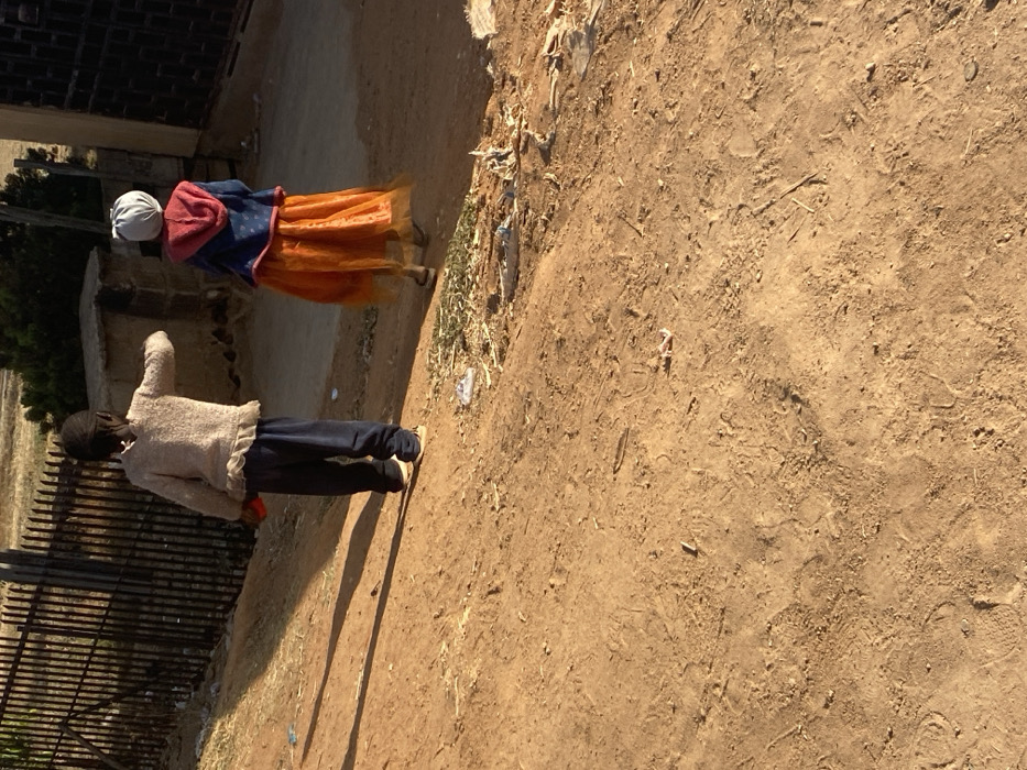 Two people stand on a bare, dirt path. One wears a blue and orange dress with a white head covering. The other wears a tan sweater and dark pants. The ground appears dry and cracked. A fence runs along the left side of the path, and some green foliage is visible behind it. The light suggests a sunny day.