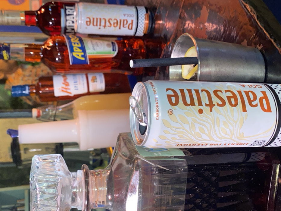 The image displays a close-up, slightly elevated view of beverages and bar items arranged on a dark, reflective surface, likely a bar counter. In the foreground, a clear glass decanter filled with a dark liquid stands to the left. Centrally, an open white aluminum can of "Palestine Cola," featuring orange text and a beige olive branch motif, is prominent. To its right, a silver-colored metal cup contains ice, a single lemon slice, and a dark paper straw. The midground and background, blurred, reveal several liquor bottles: "Petroni Aperitivo," "Aperol," and "Campari," along with a white plastic pourer and a glass bottle holding a light yellow liquid. A second, unopened can of "Palestine Cola" is partially visible behind the Campari bottle. No individuals are present in the scene. The precise location within Lisbon, Portugal, is not discernible from the provided image.