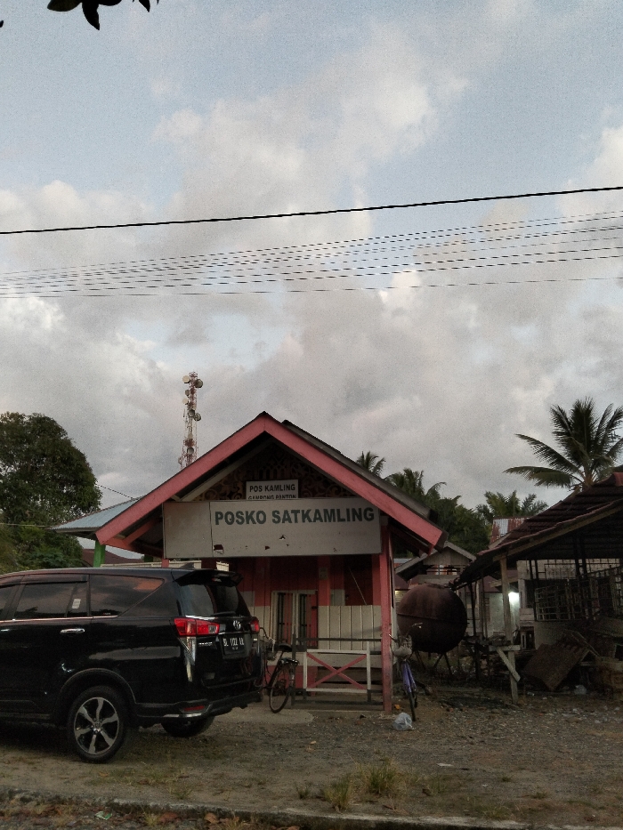 An outdoor scene in Panton, Indonesia, depicts a daytime view under an overcast sky. The central subject is a small, single-story building with a red-orange gabled roof and light-colored walls, identified by a sign that reads "POSKO SATKAMLING" and a smaller sign above it stating "POS KAMLING GAMBONG PANTON." To the left of this building, a black Toyota Kijang Innova SUV (license plate BL 1722 NL) is parked, oriented with its rear facing the viewer. A red-framed bicycle is parked near the front of the "POSKO SATKAMLING" building. To the right of the building, a large, rusty, spherical tank is situated, with another bicycle, possibly blue, parked nearby. Further to the right, a rustic, open-sided structure with a dark roof is visible, surrounded by miscellaneous debris and materials. In the background, a tall communication tower with multiple antennas rises behind the main building and to its left. Overhead, several power lines traverse the upper portion of the frame. Scattered palm trees and other foliage are visible behind the structures. The ground in the immediate foreground and around the buildings appears to be unpaved dirt or gravel. No individuals are visible in the scene.