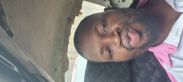 A man poses for a close-up selfie, his face filling much of the frame. He has dark hair, a beard, and brown eyes. His lips are pursed in a playful kiss. He wears a white shirt with a bright pink collar. The background shows the interior of a car, with the ceiling panel visible and parts of the dashboard. The image is slightly rotated, placing the man's head at an angle.