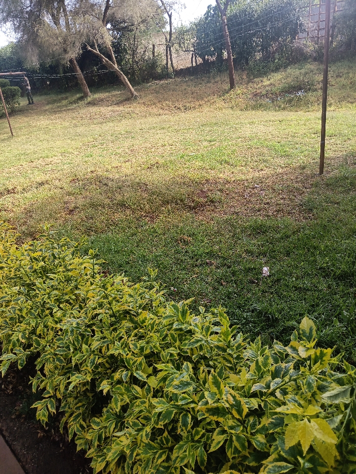 A sunny, grassy lawn transitions from bright green to a yellow-tinged section at the back