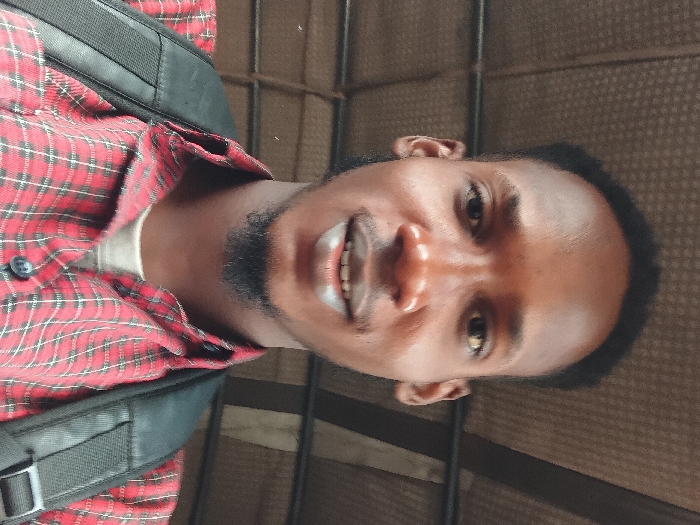 A young Black man wearing a red and black plaid shirt and black backpack smiles broadly. His skin is brown and slightly glossy. He has a short beard and black hair. The background appears to be a textured, neutral color with some linear elements. The angle of the image is slightly tilted.
