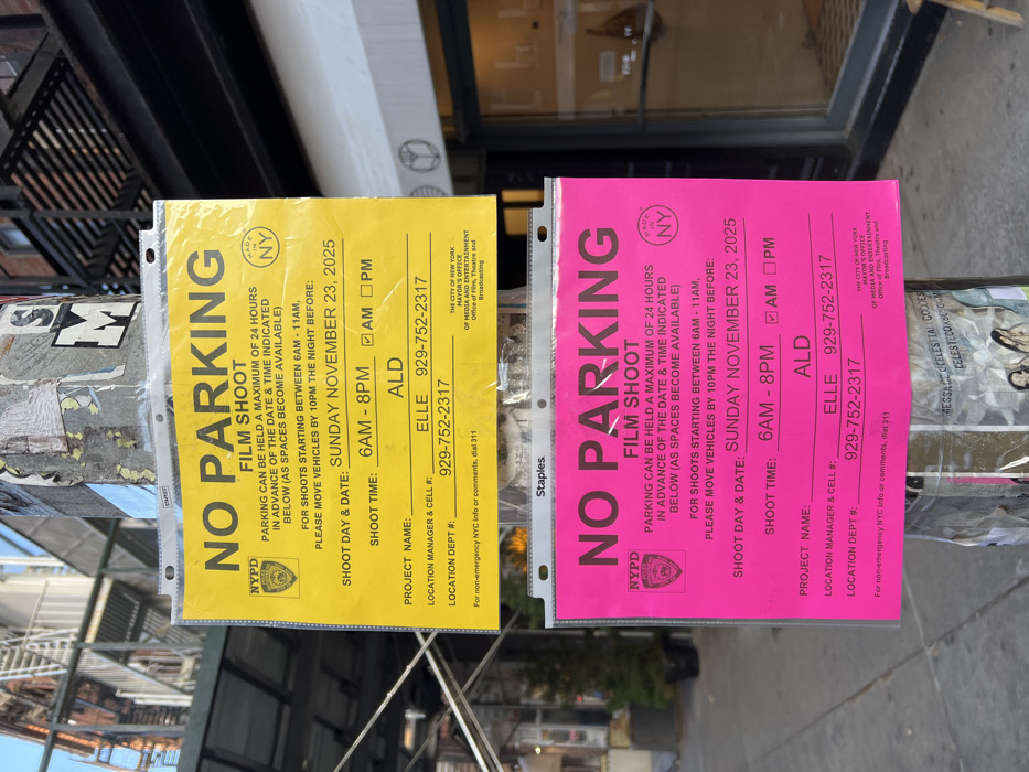 Two signs are attached to a post, one yellow and one pink, both displaying “NO PARKING” for a film shoot