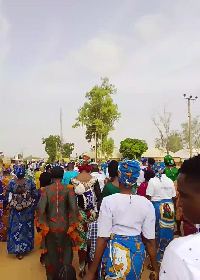 crowd of people walking down a dirt road. Most are women, wearing colorful patterned dresses and headwraps. A few men and children are also visible. The environment appears to be a rural or semi-rural area with scattered trees and simple buildings in the background. There is a telephone pole visible. The sky is overcast. The camera follows the crowd from behind, and no audio is present.