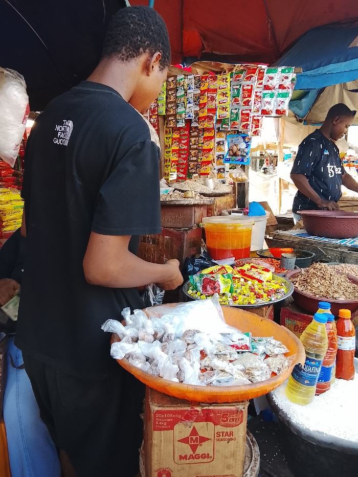 A bustling market scene displays various food items. A person in a black t-shirt examines bagged spices in an orange tray on a Maggi seasoning box. Nearby, a silver tray holds colorful seasoning packets. Plastic bottles, potentially containing oils or sauces, stand next to a large container of what appears to be white rice. Another person works behind the counter. The background features rows of hanging condiment packets.