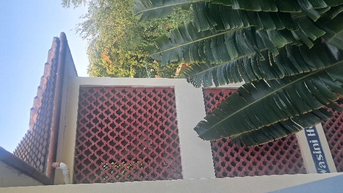 A low-angle shot showcases a building exterior with patterned terracotta panels set within white frames. A tile-covered roof is visible on the left. Lush green banana leaves dominate the right side of the frame, partially obscuring another similar panel. A sign with lettering is partly visible behind the leaves. Trees and a clear blue sky form the background.