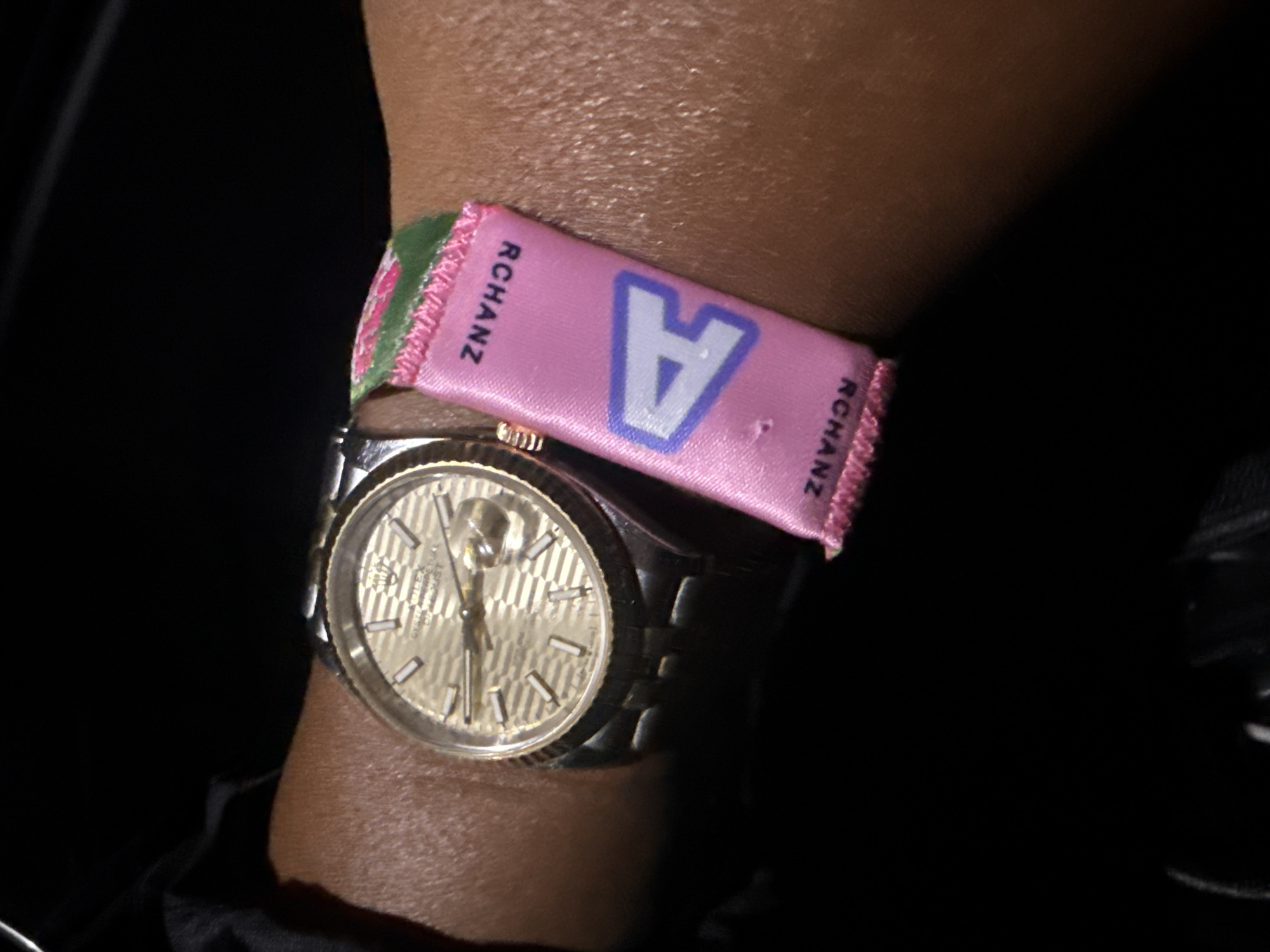 A close-up photograph shows a person's left wrist adorned with a watch and a pink wristband. The watch is stainless steel with a gold-colored face featuring a textured pattern and gold hands. Positioned above the watch is a pink wristband with the word "RCHANZ" printed in black on either side of a large letter "A" in light blue. The wristband has a ruffled edge. The background is dark and blurry, suggesting an indoor environment with poor lighting. The image does not offer enough details to specify the location within the city of Indio, United States of America.